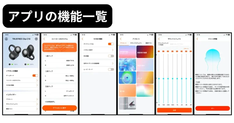 TRUEFREE専用アプリでは、ゲームモード、イコライザープリセット、ボタン操作のカスタマイズなど多機能が使えます。ただし、実際に設定を変えても体感での音質変化は控えめで、デフォルト設定でも問題なく使える印象でした。