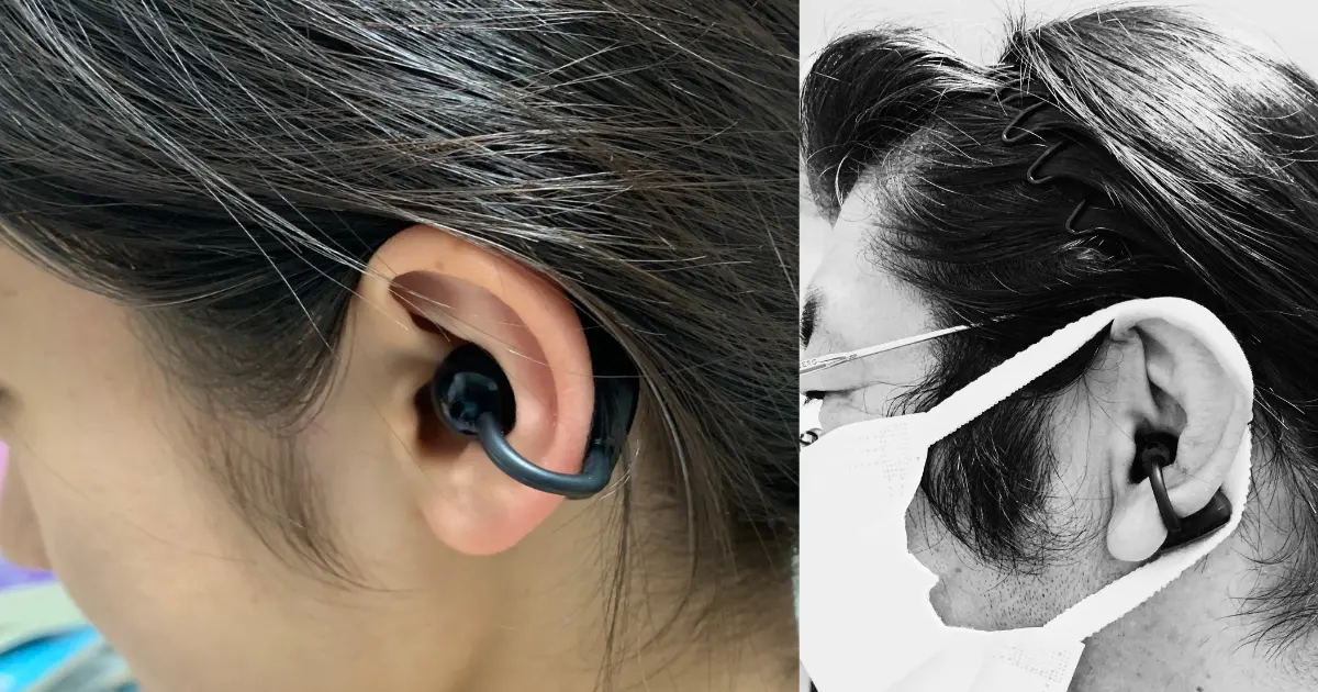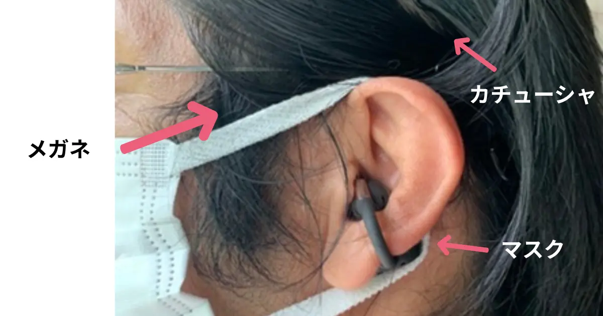 イヤーカフ型のもう一つの魅力は、マスクやメガネとの干渉が少ないこと。